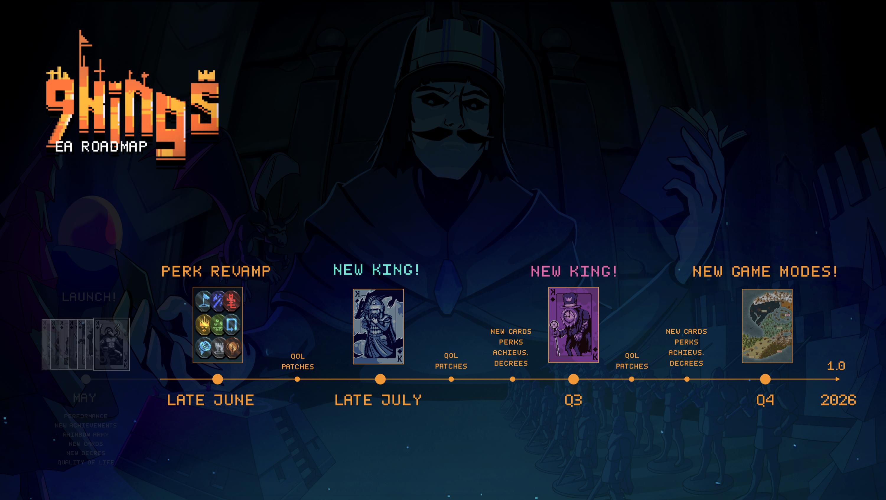 Систему перков намерены переработать «...чтобы сбалансировать долговечность с принятием стратегических решений. Другими словами: мы хотим, чтобы у вас было больше причин продолжать играть в 9 Kings, не делая игру слишком гриндовой, более несбалансированной или не ставя под угрозу наш минималистичный дизайн. Спойлер: вы сможете повышать уровень выше 9-го». Первая версия системы должна появиться до конца июня.