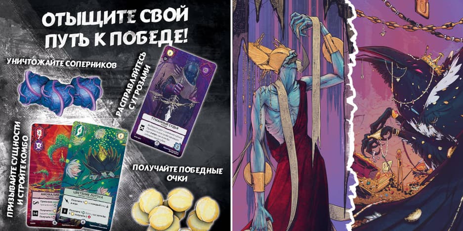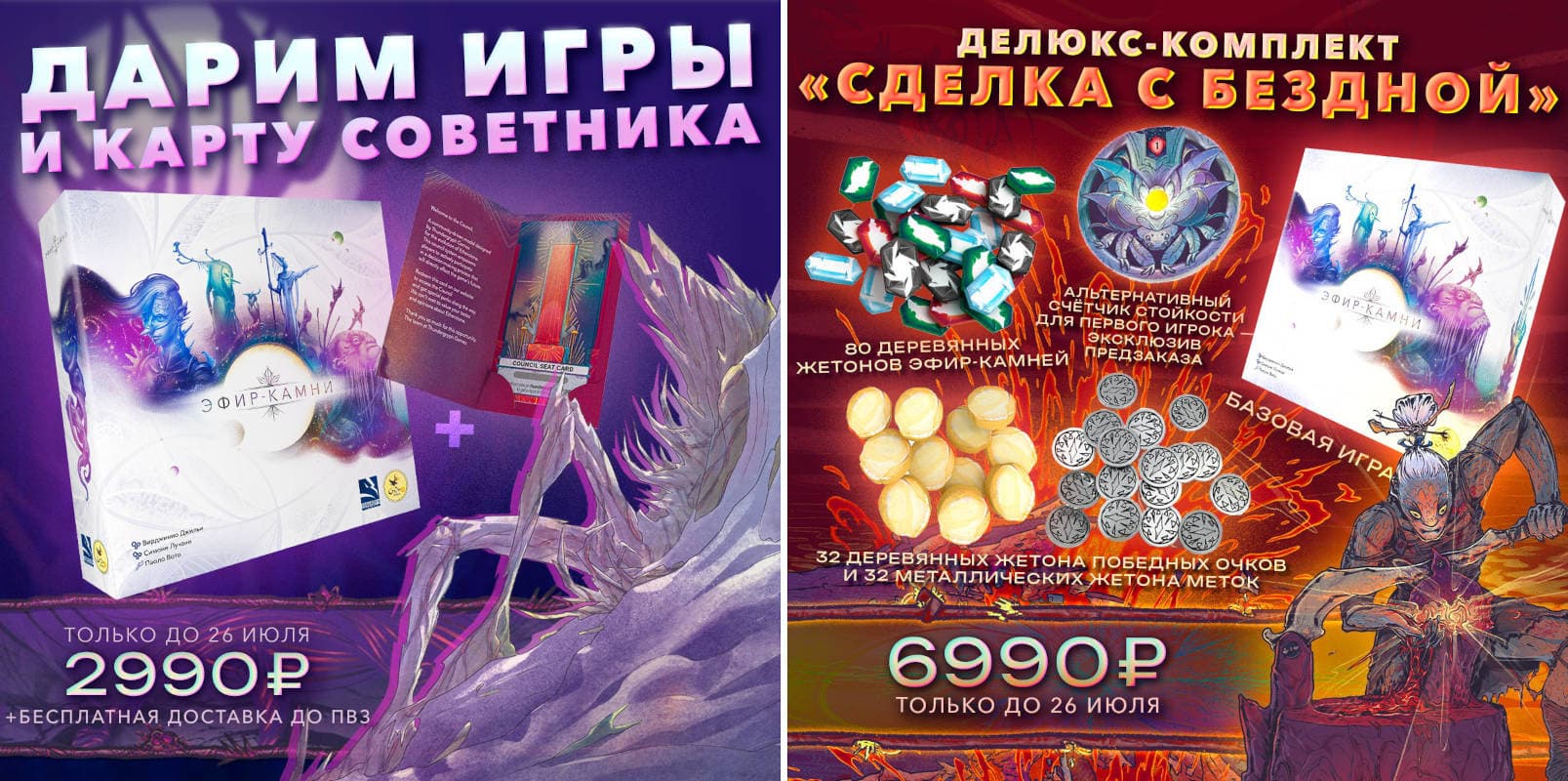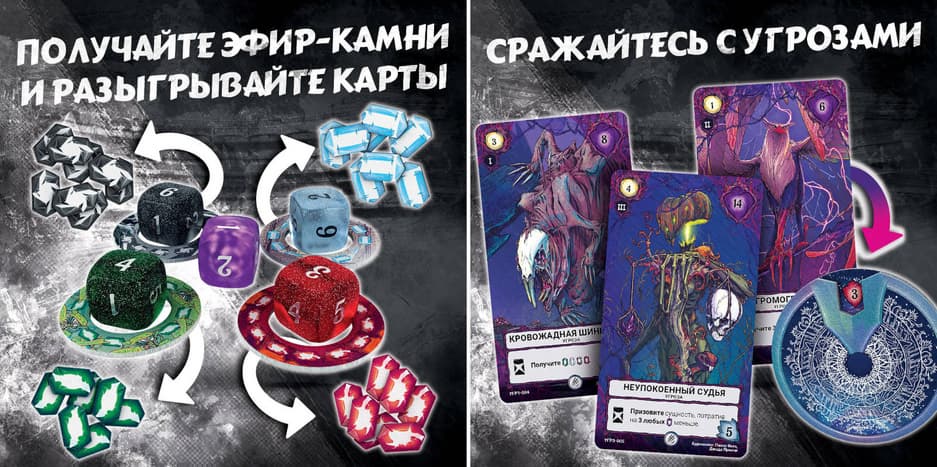 Также за 6990 рублей можно будет приобрести делюкс-комплект «Сделка с Бездной» (всего будет 500 штук), содержащий базовую игру, 80 деревянных жетонов эфир-камней, альтернативный счетчик стойкости для первого игрока, 32 деревянных жетона победных очков и 32 металлических жетона меток.