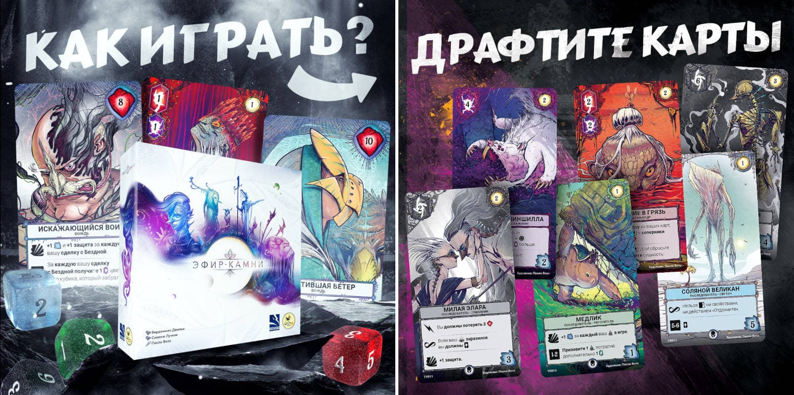 Уже на этой неделе пользователи из России получат возможность заранее заказать настольную игру «Эфир-камни», сочетающую в себе механики драфта карт и кубиков, асимметрию и систему менеджмента ресурсов.