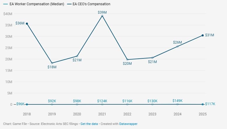 Эндрю Уилсон, руководитель Electronic Arts, по итогам финансового года, завершившегося 31 марта 2025 года, получил вознаграждение на $5 миллионов больше, чем годом ранее. Общая сумма — $30,5 млн, включая акции и бонусы.