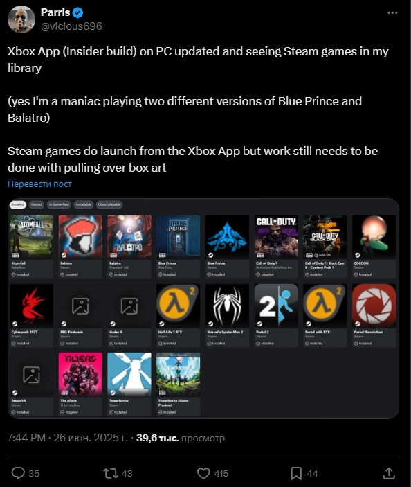 «Я вижу свои Steam-игры в Xbox-приложении. Да, я тот самый фанат, у которого два экземпляра Blue Prince и Balatro. Игры запускаются, но над отображением и загрузкой обложек ещё нужно поработать».