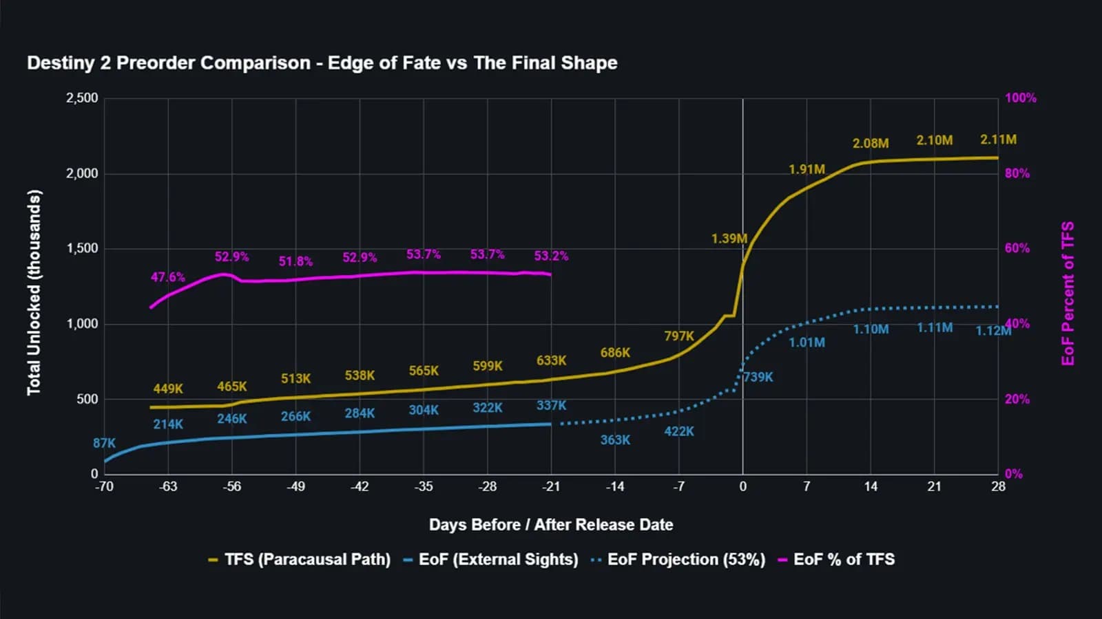 Официальной статистики от Bungie нет, но пользователи нашли способ оценить масштаб провала. Предзаказавшие дополнение получают уникальный внутриигровой значок — и это позволяет отследить их количество. Выяснилось, что на ту же дату до релиза в 2023 году предзаказов было на 47% больше.