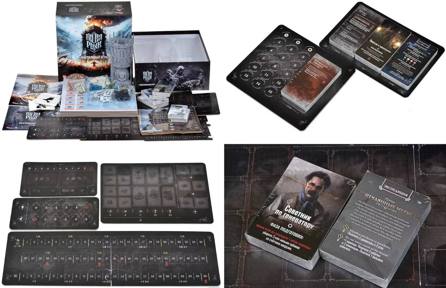 Коробка с Frostpunk содержит генератор с поддоном высотой 200 мм, фрагмент генератора, улучшение генератора, планшеты генератора, надежды и недовольства, запаса, раундов и утра, населения, зданий и вечера, 12 фрагментов рубежа, мешочки недовольства и надежды, 30 фрагментов поля, пять фрагментов скал, четыре листа советников, 199 больших карт, 107 средних карт, 148 маркеров, 162 токена, книгу сценариев и правила игры.