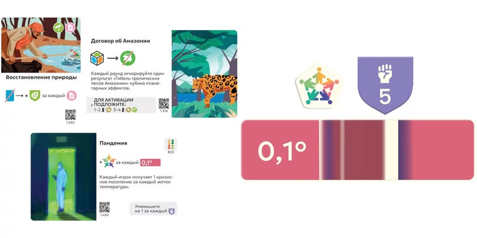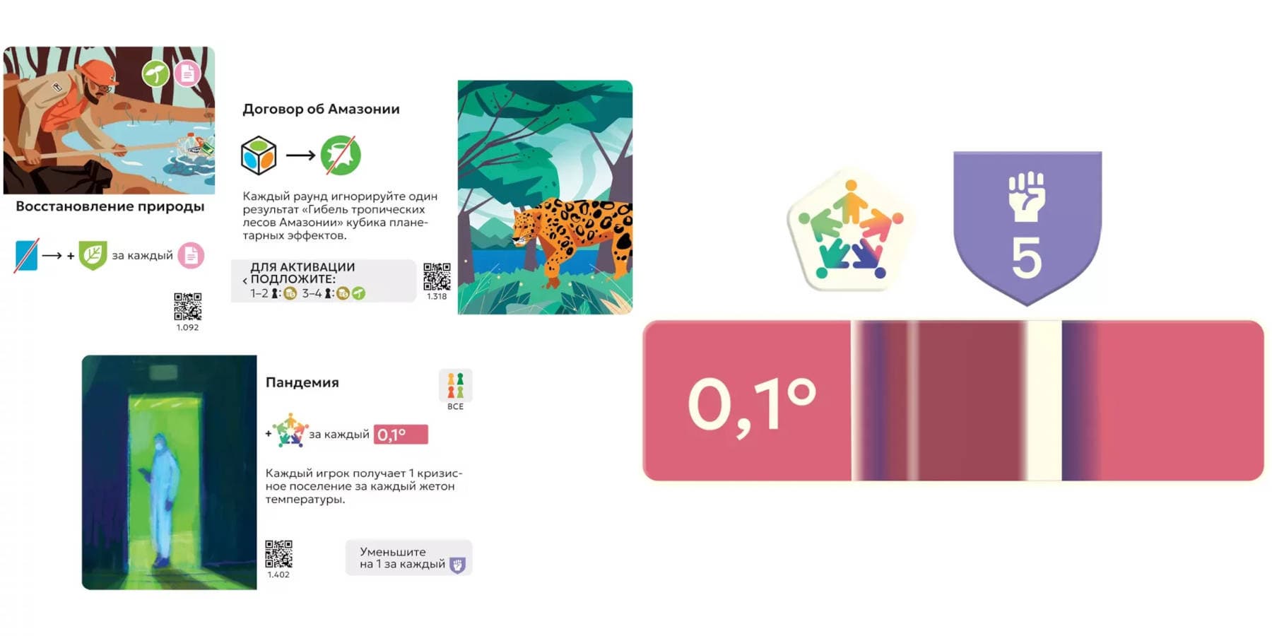 Для победы, а партия обычно занимает 60-90 минут, необходимо достигнуть сокращения – момента, когда планета начинает восстанавливаться. Если температура вырастет на 2,0 C или одна из держав получит 12 кризисных поселений, то тогда проиграют все участники.