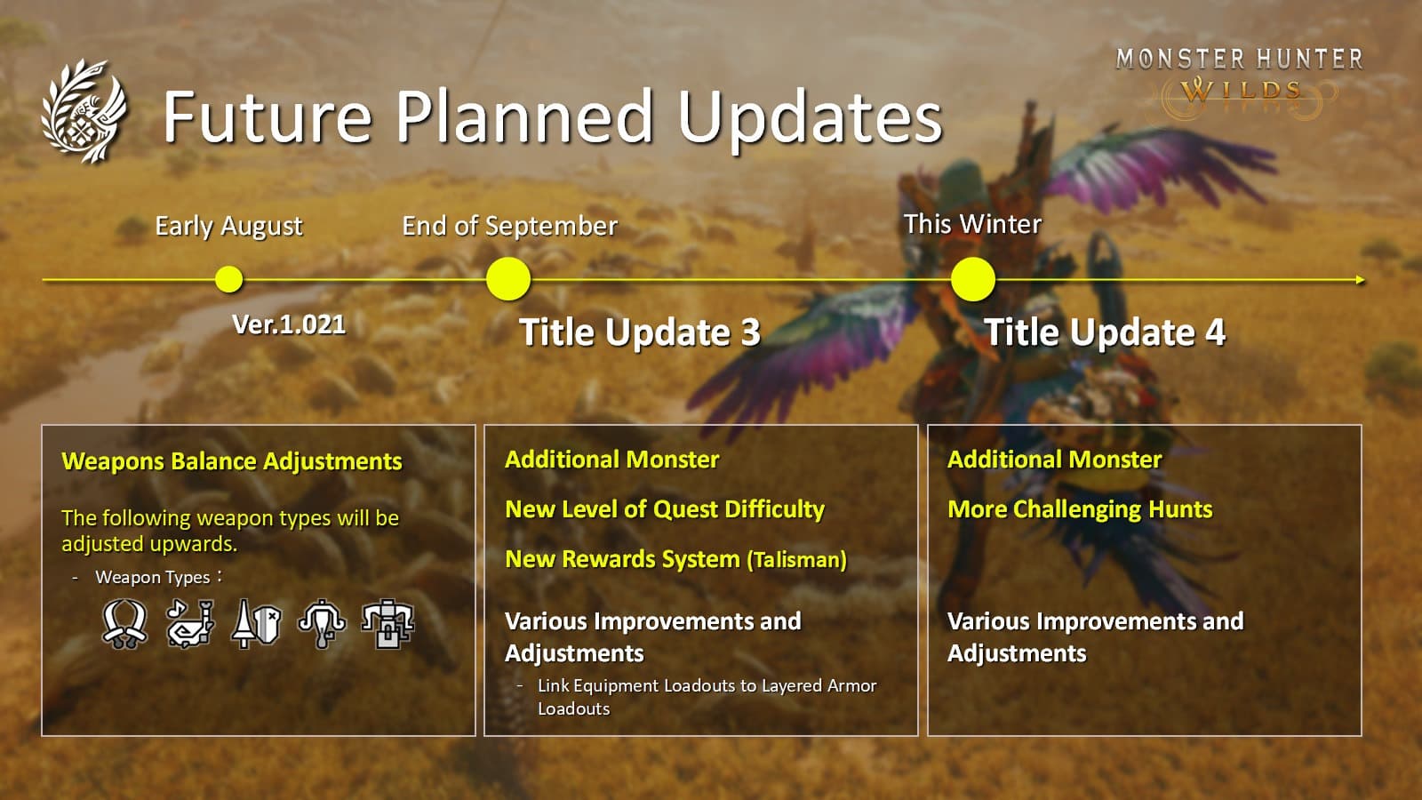 Также компания поделилась планами на четвёртое обновление, запланированное на зиму. Оно добавит очередного монстра и новые вызовы для опытных игроков. Также Capcom ищет способ сохранить актуальность оружия Артиан и параллельно работает над удобством интерфейса, стабильностью клиента и исправлением багов.