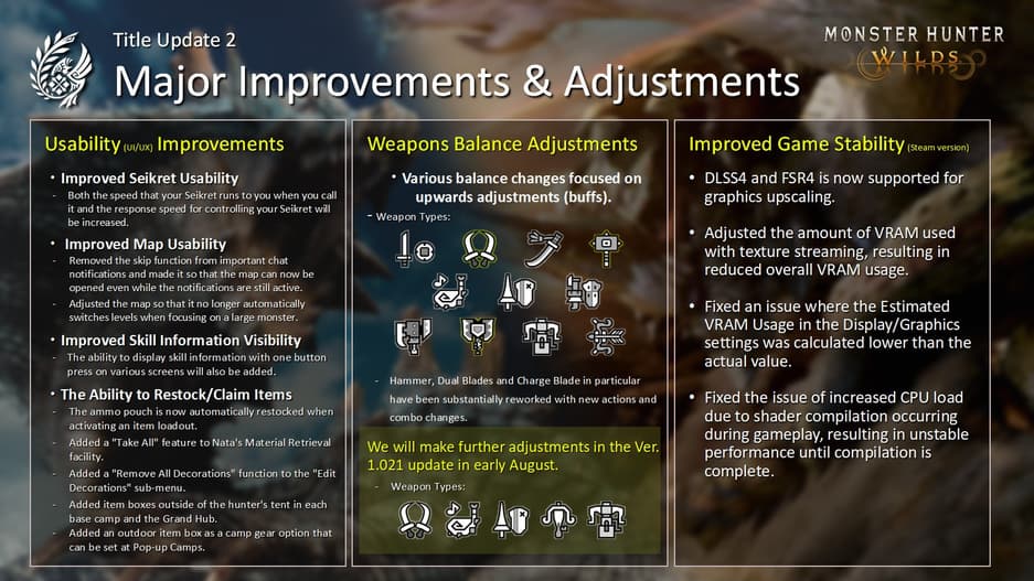 30 июня 2025 года в Monster Hunter Wilds выйдет второе крупное обновление. В нём появятся два новых монстра и временная версия усиленного Ут Дуны. Но часть игроков продолжает жаловаться на скудность контента в эндгейме. Решать эту проблему Capcom планирует в третьем патче, который выйдет к концу сентября.