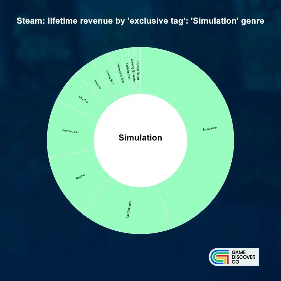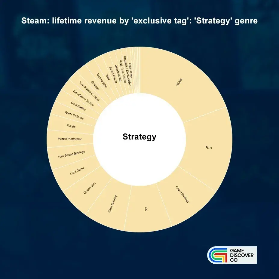 В GameDiscoverCo решили изучить игры Steam и оценить распределение выручки по конкретным жанрам игр. Для этого рассматривали игры, собравшие более 1 миллиона долларов, оставив для каждой по два тега — один для жанра и один поджанровый.