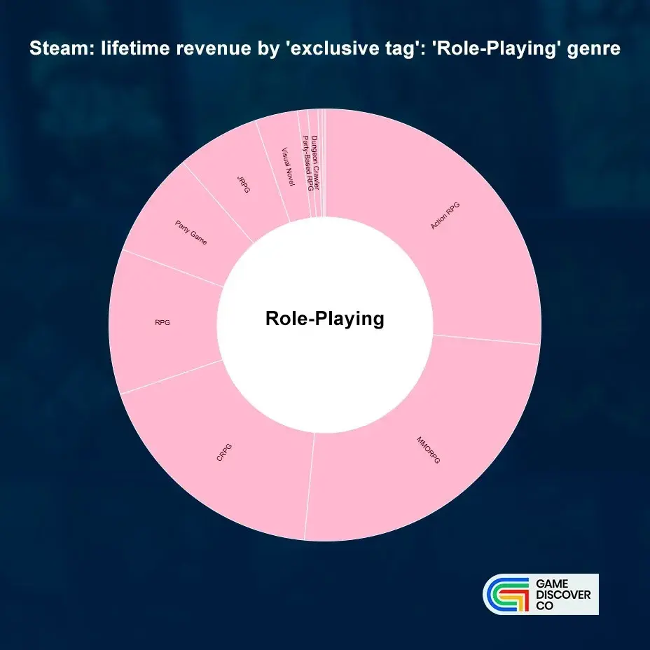 - Оставшаяся доля приходится на другие ключевые поджанры: королевская битва (9,89%), soulslike (5,65%), survival horror (5.17%), геройский шутер (4,12%), шутер с видом от третьего лица (2,86%), Hack and Slash (2,55%).