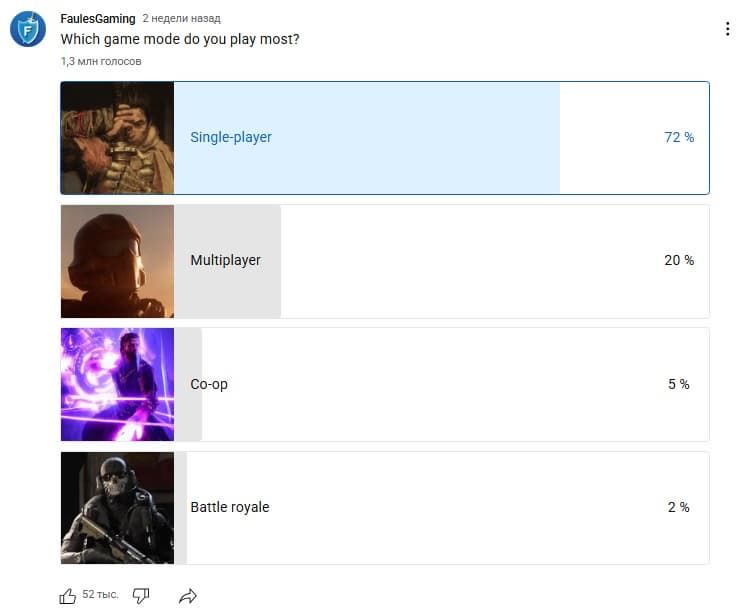 Крупный опрос показал: большинство геймеров предпочитает одиночные игры. Из более чем 1,3 млн проголосовавших около миллиона выбрали синглплеер, а мультиплеер получил только 250 тысяч голосов. Остальные распределились между кооперативом (5%) и королевскими битвами (2%).
