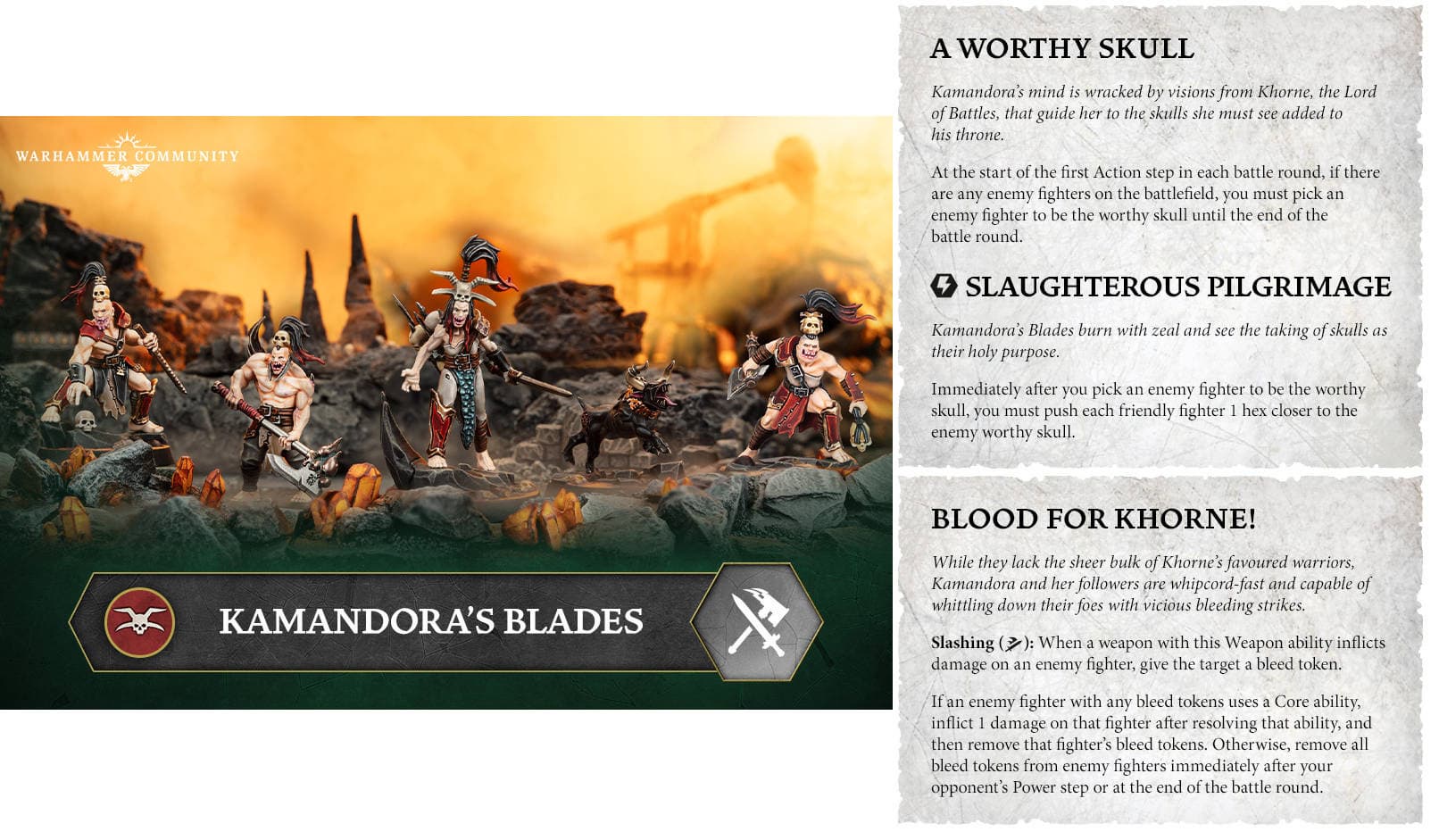 В ближайшем будущем поклонники Кхорна и настольной игры Warhammer Underworlds смогут предзаказать банду «Клинки Камандоры», в которой удастся обнаружить таких бойцов как Камандора, Трокк, Каннат, Галиста и Антро Краст, а также раздобыть колоду Raging Slayers для режима Rivals.