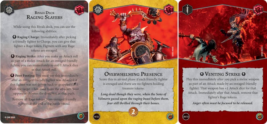 Вместе с вышеуказанной бандой компания Games Workshop также намеревается выпустить Raging Slayers – новую колода Rivals. Её ключевая механика – ярость. Всякий раз, когда дружественный юнит совершает Charge-атаку, игрок может дать ему жетон ярости и статус гнева.