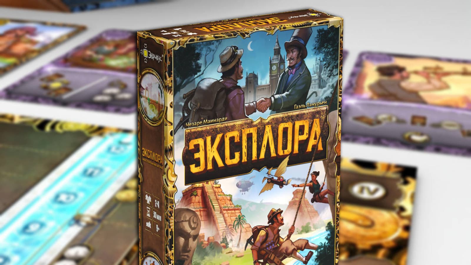 Настольная игра «Эксплора» уже доступна для русскоязычных поклонников приключений в духе Индианы Джонса, поэтому пришло время вступить в Клуб Ливингстона, обзавестись командой и отправиться на поиски артефактов в мифических землях.