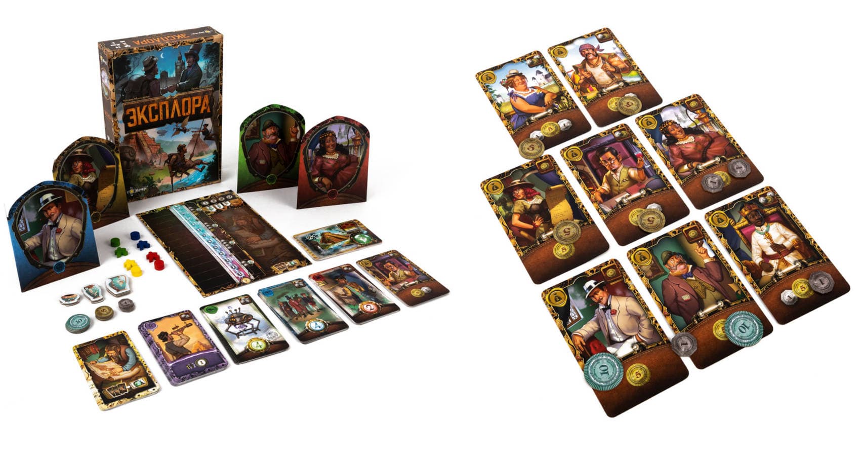 В коробке с «Эксплорой» удастся обнаружить игровое поле, восемь карт транспорта, восемь карт экипажей, восемь карт исследователей, восемь карт меценатов, 12 особых карт, семь карт картографов, девять карт экспедиций, четыре маркера инициативы, четыре ширмы игроков, восемь фишек команд, 48 жетонов монет, 24 жетона артефактов и правила игры.