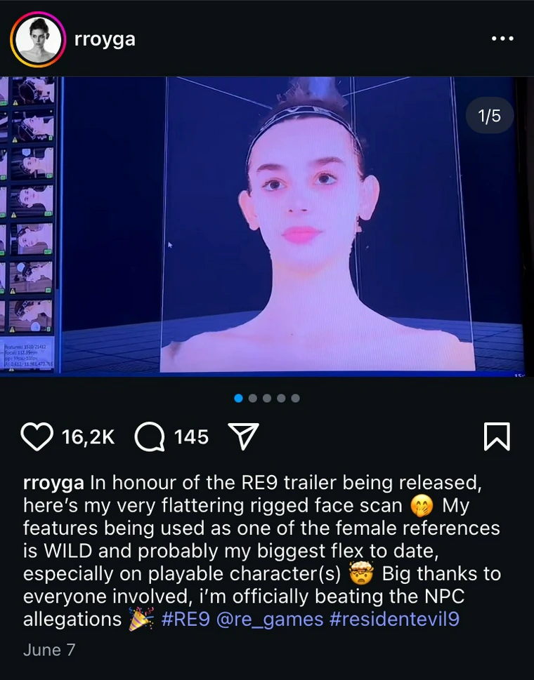 Модель Ройя Атина Roya Athina (@rroyga) официально поучаствовала в работе над Resident Evil Requiem — публикация появилась несколько недель назад, но заметили её лишь недавно. Лицо стали сравнивать с имеющимися промо-кадрами.