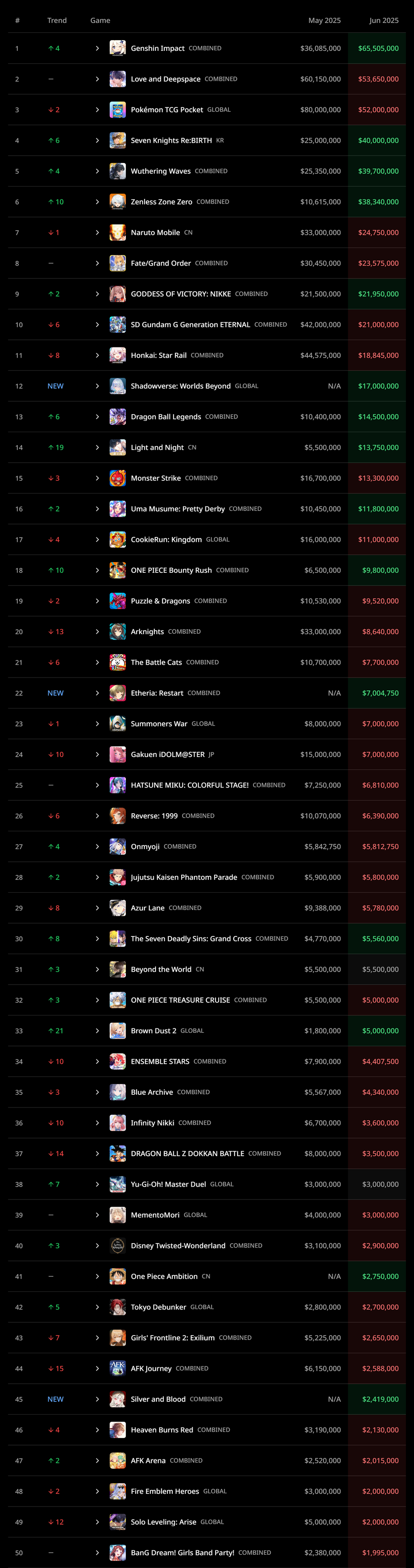 Список самых прибыльных гача-игр за июнь 2025 года. В данном случае учитываются данные только с мобильных устройств (изображение можно найти по следующей ссылке)