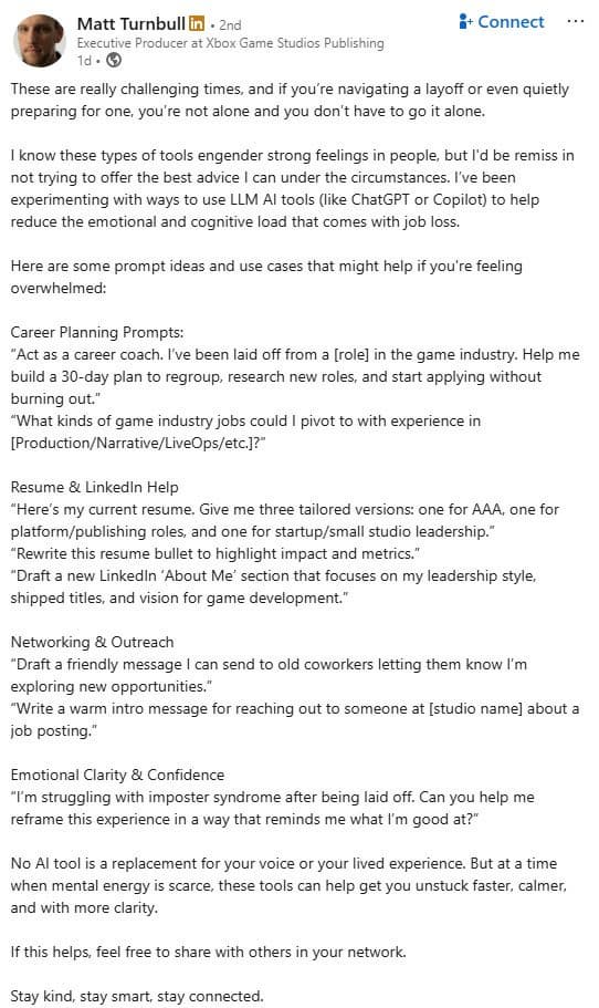 Исполнительный продюсер Xbox Мэтт Тернбулл вызвал волну критики после того, как предложил уволенным сотрудникам Microsoft использовать ИИ-инструменты вроде ChatGPT и Copilot, для карьерного планирования, налаживания контактов и достижения «эмоциональной ясности и уверенности». В частности, он предложил такие подсказки для ИИ, как: «Я борюсь с синдромом самозванца после увольнения. Можете ли вы помочь переосмыслить этот опыт так, чтобы напомнить мне, в чем я хорош?».