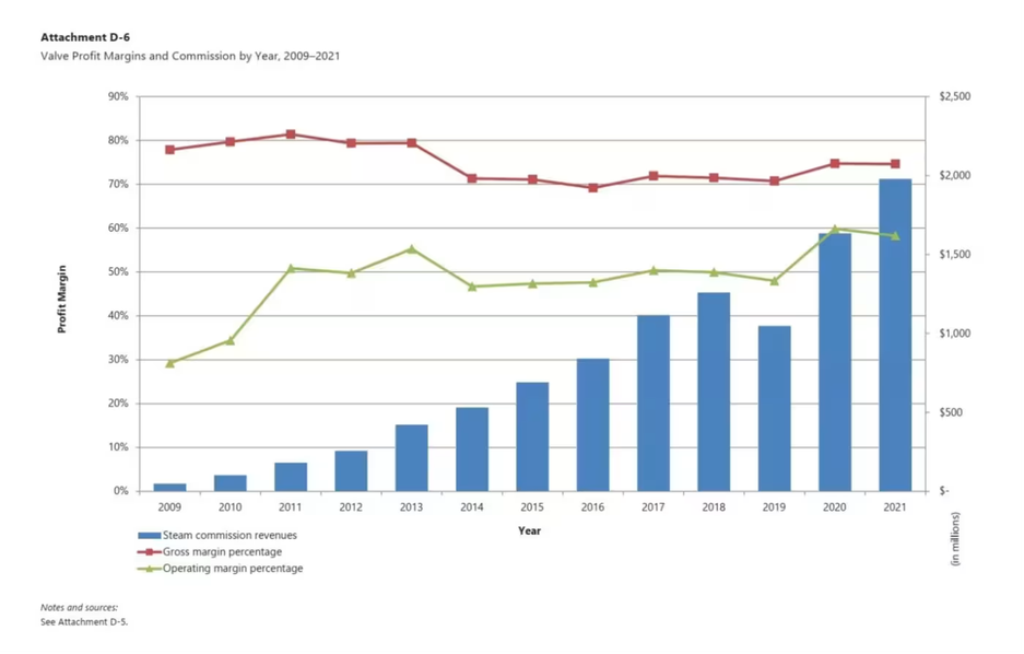 Последний известный показатель выручки от комиссии превысил 2 миллиарда долларов (синий цвет на графике); операционная маржа Steam около 60%, т.е. прибыль от одних комиссий за 2021 год составила около 1,3 миллиарда долларов.