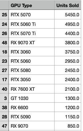 Следом за ней — тоже решения от NVIDIA: второе место у RTX 5060 Ti с 4950 продажами, третье заняла RTX 5070 Ti с результатом в 4400 штук. В сумме три модели из линейки RTX 50 обеспечили свыше 14 тысяч продаж только на одной площадке.