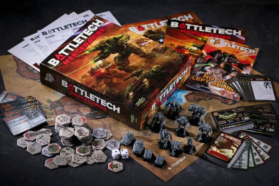 В коробке люди обнаружат 12 миниатюр, кампанию о настоящих наёмниках (контракты, трофеи и запоминающиеся бои), карты поддержки – артиллерия, мины и штурмовики, новое поле, жетоны, постер-карту Внутренней Сферы и даже короткую новеллу.
