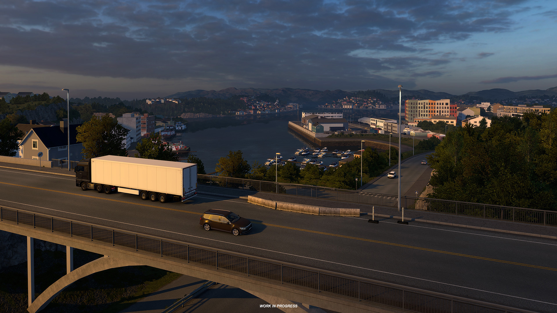 SCS Software представила подборку скриншотов, на этот раз решили рассмотреть Кристиансунн (Kristiansund) — город располагается на четырёх разных островах. В него можно попасть либо с запада через Atlanterhavstunnelen (тоннель через Атлантический океан), который является частью норвежской окружной дороги 64, либо с юга через Omsundbrua (мост Омсунд).