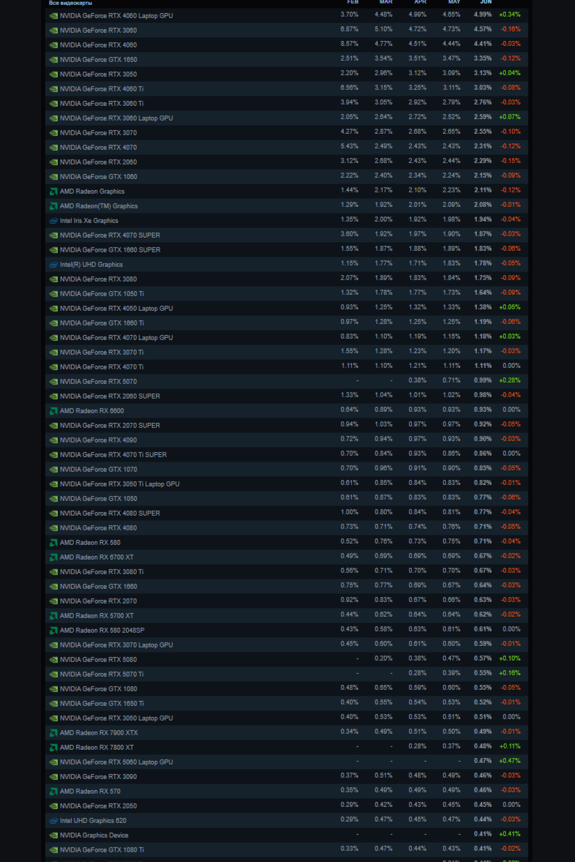 Примечательно, что в июньской выборке по-прежнему отсутствуют видеокарты AMD Radeon RX 9000 — вероятно, из-за их низкой распространённости среди пользователей Steam. Аналогичная ситуация наблюдается и с графическими адаптерами Intel. В целом по итогам второго квартала 2025 года NVIDIA сохраняет более 90 % рынка, оставляя конкурентам лишь символические доли.