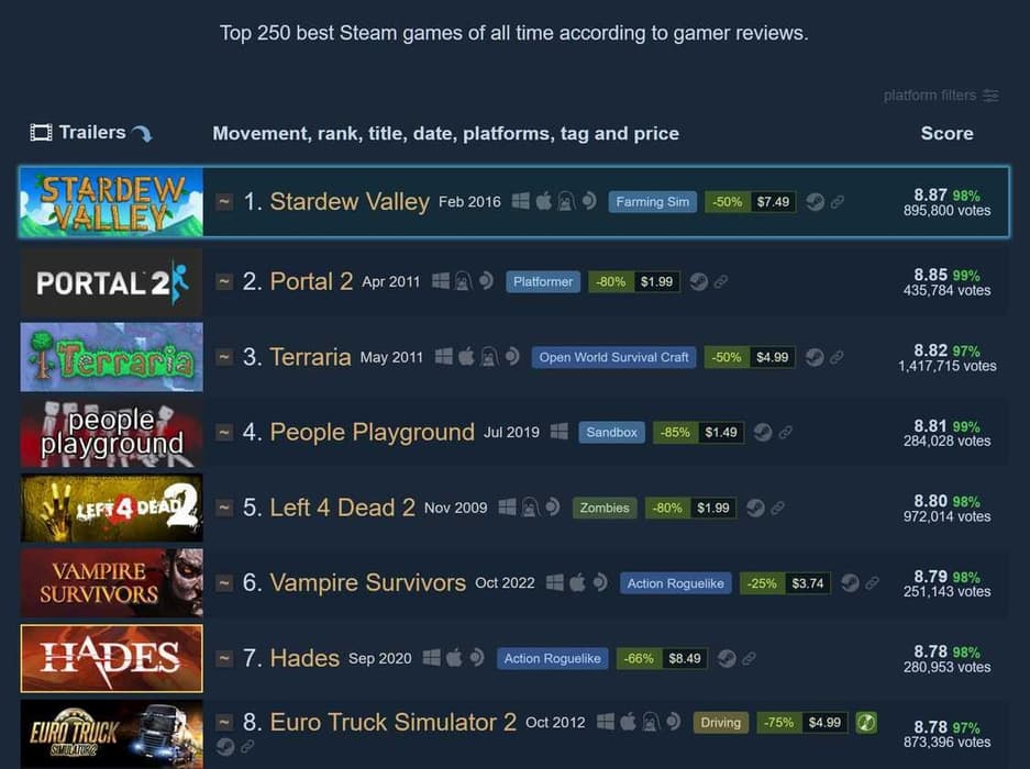 Теперь у Stardew Valley появилось новое достижение — она стала самой высокооценённой игрой в истории Steam, обогнав Portal 2. Об этом сообщил пользователь Reddit с ником u/im-not-sorry-jon. По его данным, у игры средняя оценка — 8.87 балла, а рейтинг одобрения превысил 98%. Portal 2 отстала буквально на 0.02 балла. Повышение интереса вызвала летняя скидка, что спровоцировало волну отзывов.