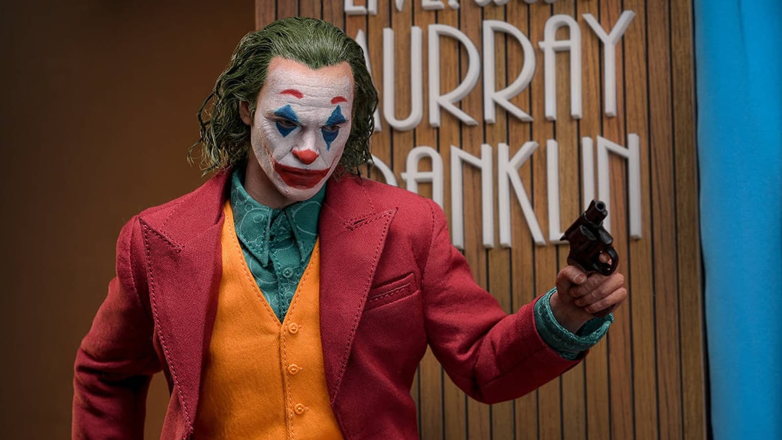 В комплекте есть 10 сменных рук, пиджак красного цвета, жилет оранжевого цвета, темно-зеленая рубашка с узорами, брюки красного цвета, белые носки, коричневые туфли, пистолет, кресло, маска клоуна, сигарета, блокнот, специально разработанная тематическая подставка-диорама со светодиодной подсветкой и фоном с текстурой дерева.
