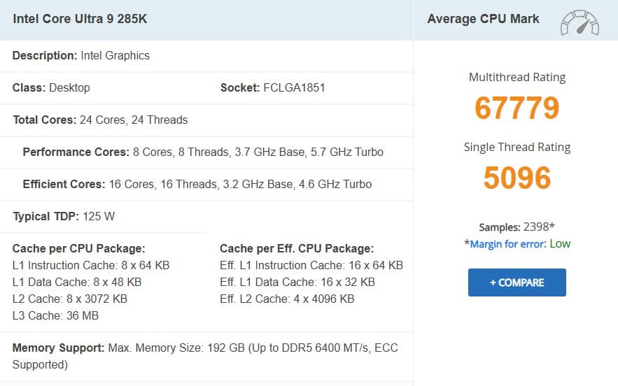 - Intel Core Ultra 9 285K — 5096 баллов