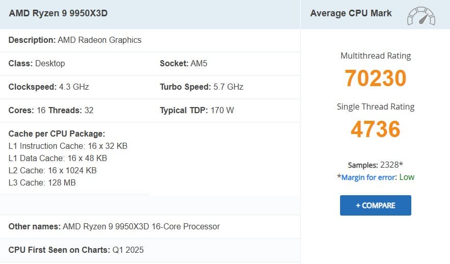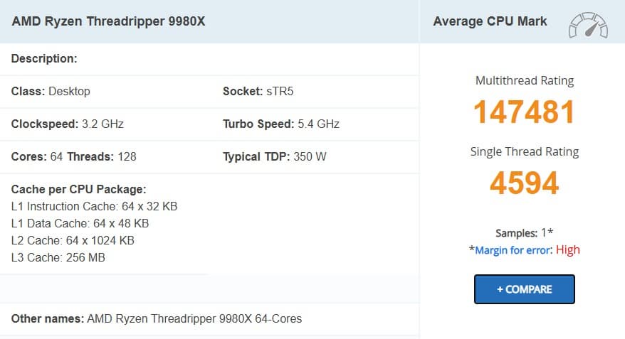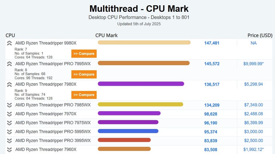 Процессор AMD Ryzen Threadripper 9980X занял первое место в многопоточном рейтинге PassMark, обогнав даже 96-ядерный Threadripper PRO 7995WX. Это особенно интересно, учитывая, что у него на 32 ядра и 64 потока меньше.
