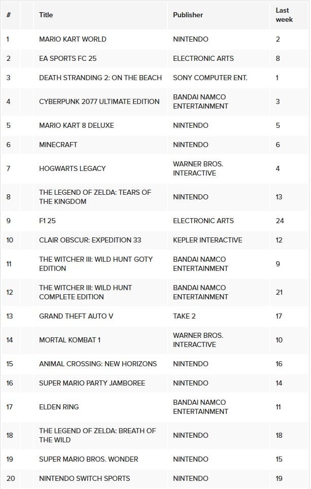В десятку лучших также вошли Minecraft, Hogwarts Legacy, The Legend of Zelda: Tears of the Kingdom и F1 25. Как видно, британский рынок остаётся верным проверенным брендам.