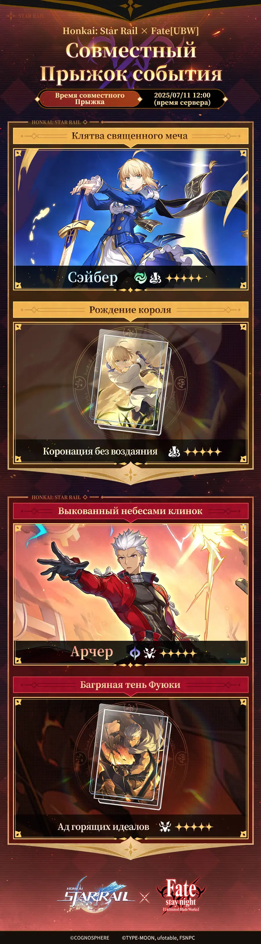 - Во время события совместной акции совместный эксклюзивный персонаж 5★ Сэйбер (Разрушение: Ветряной) может быть получен только в совместном Прыжке события персонажа «Клятва священного меча». Совместный эксклюзивный персонаж 5★ Арчер (Охота: Квантовый) может быть получен только в совместном Прыжке события персонажа «Выкованный небесами клинок».