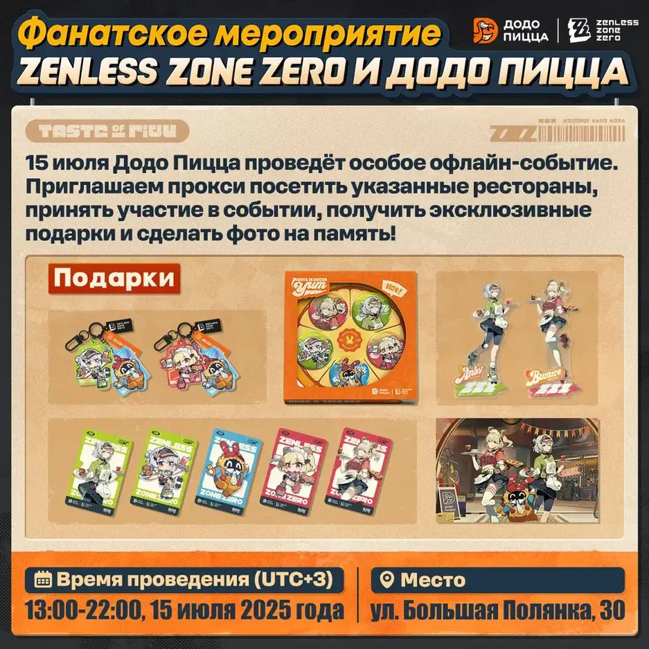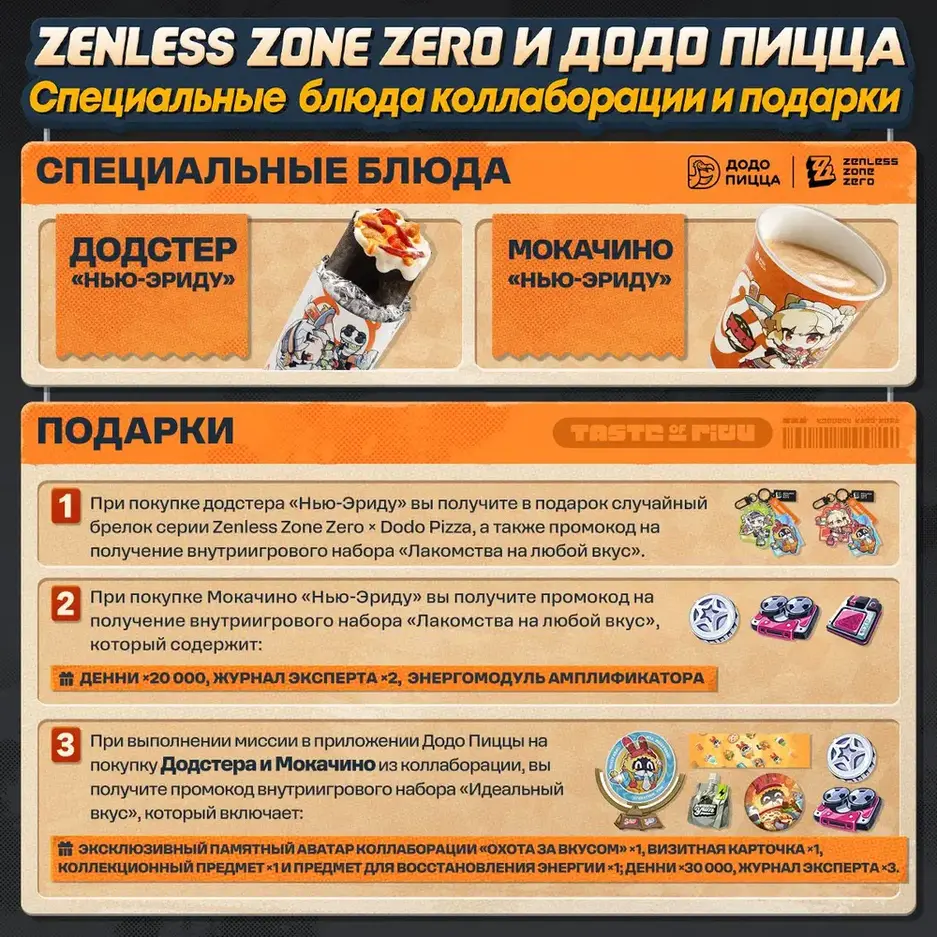 В ходе коллаба Zenless Zone Zero x «Додо Пицца» посетители смогут приобрести специальные блюда «Додстер "Нью-Эриду"» и «Мокачино "Нью-Эриду», а также заполучить мерч, например брелок. Помимо этого, есть возможность получить промокод на внутриигровые бонусы.