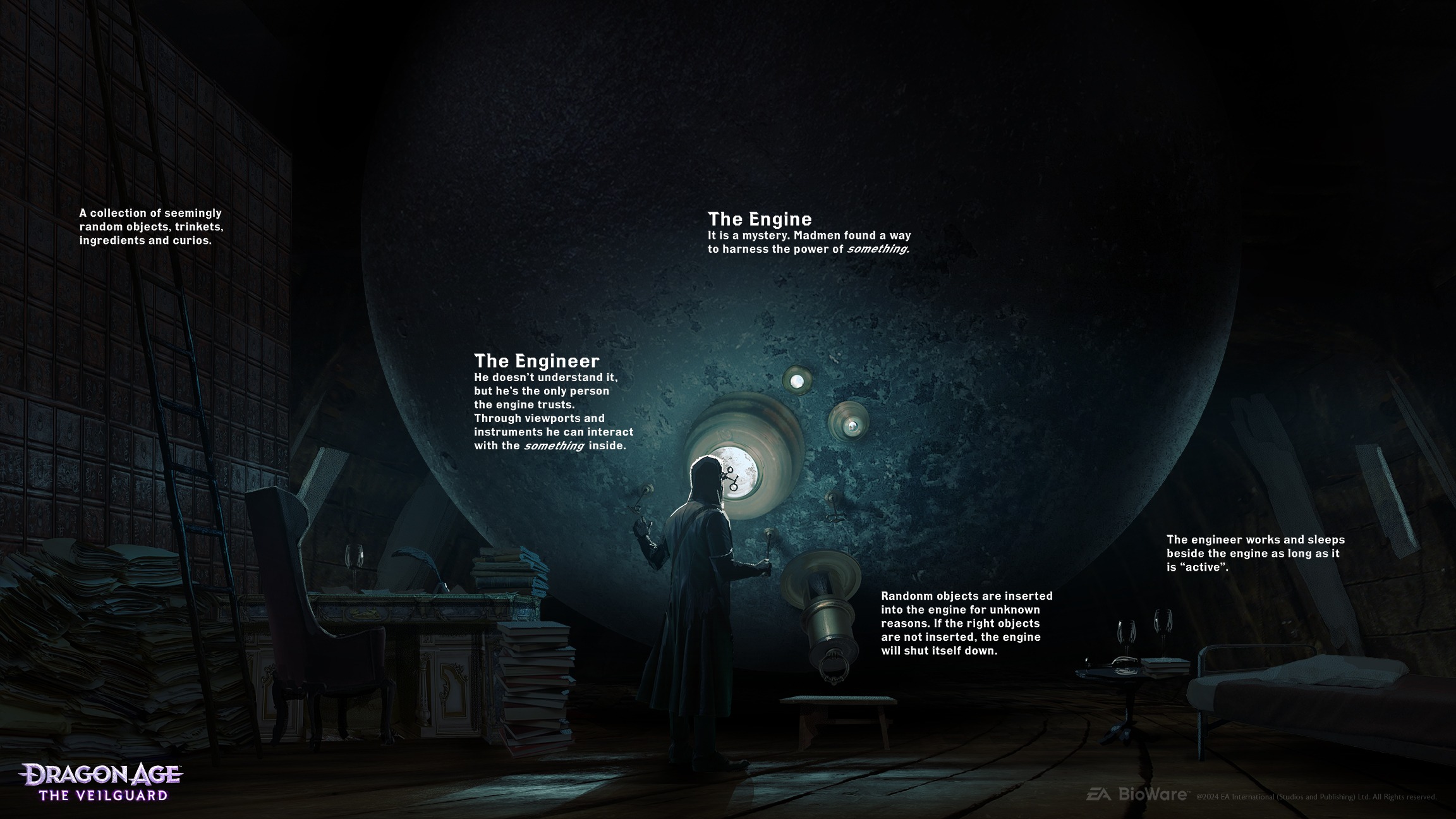 В 2016 году действие Veilguard хотели развернуть в неизведанном регионе Тедаса. Группа охотилась за «самым опасным человеком в мире» — Соласом, который в ранней версии был более жестоким. Герои скрывались на подлодке, потому что обычный корабль не подходил для скрытного перемещения — слишком легко отследить.