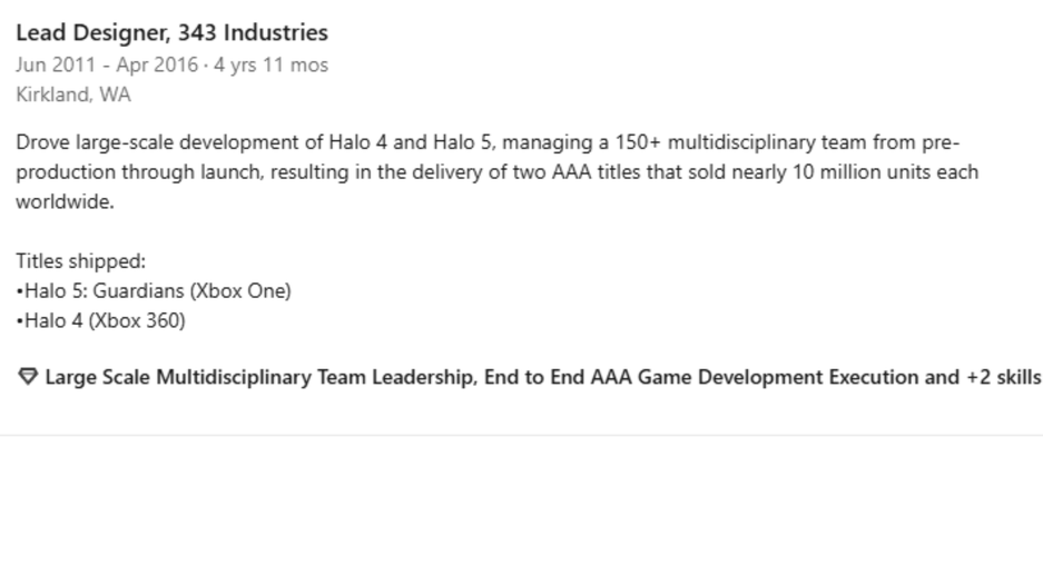 Судя по записи специалиста, продажи шутеров Halo 4 и Halo 5 Guardians приблизились к 10 миллионам копий (у каждого). Предполагается, что эти данные актуальны на момент его ухода из команды.