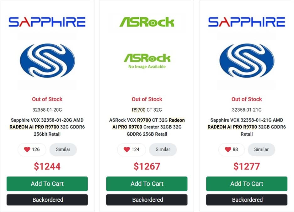 Теперь известны и цены: R9700 замечена у Tech-America в трёх вариантах — один от ASRock и два от Sapphire. Стоимость — от $1244 до $1277.