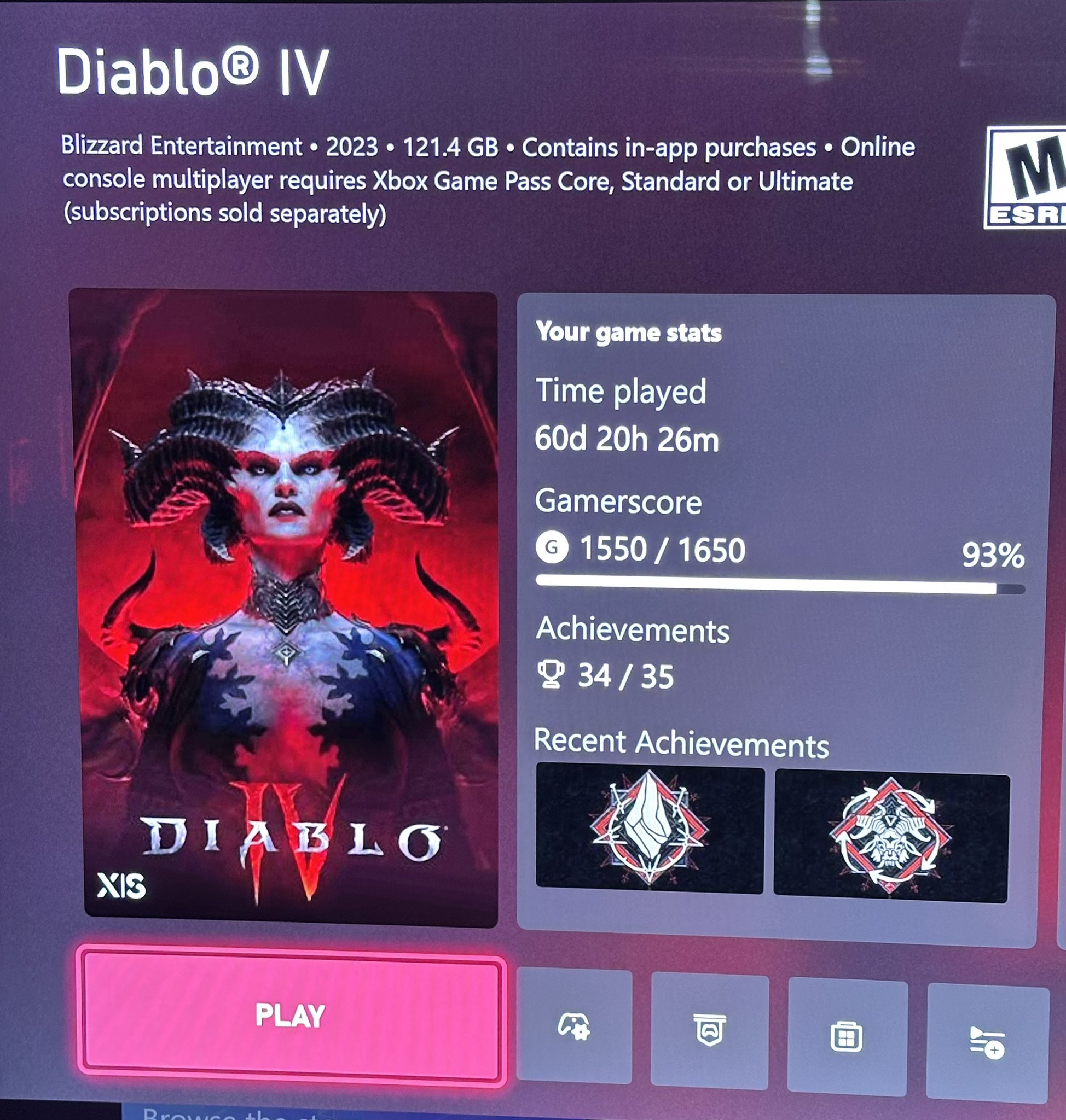 Род опубликовал скриншот своей игровой статистики в Diablo 4: суммарное игровое время превышает 1500 часов, при этом он выбил 34 из 35 достижений (Gamerscore 1550 / 1650).
