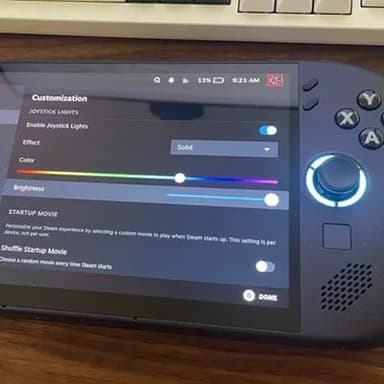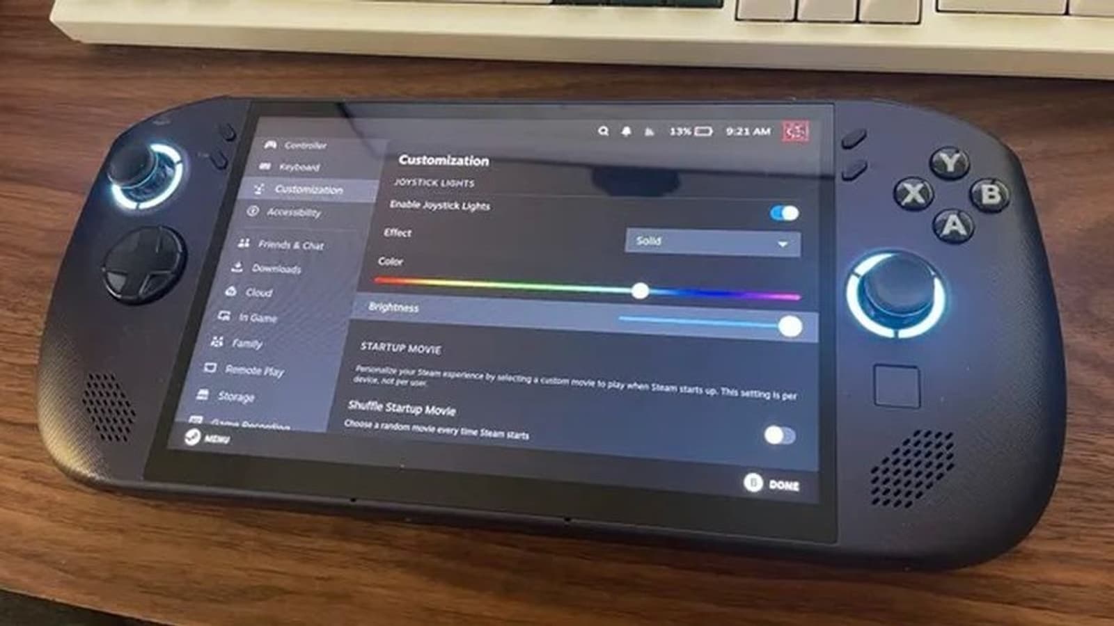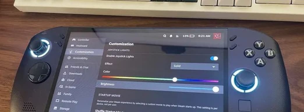 В свежем апдейте Steam Deck Beta Client от 14 июля появилась настройка светящихся джойстиков. Теперь всё можно включить прямо в меню (Settings > Customization): выбрать режим (например, постоянное свечение или «радужный» эффект) и изменить яркость.
