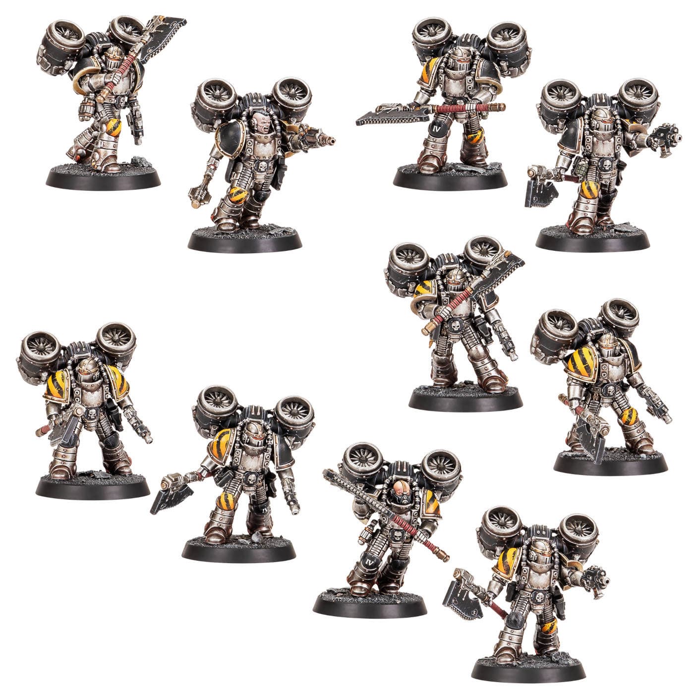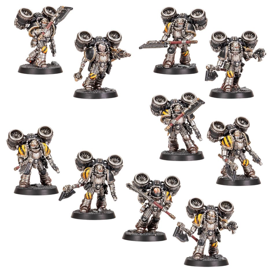 Плюс набор содержит опциональные боевые щиты, которые можно поменять местами с пистолетами, силовые молоты, тяжелые цепные топоры, волкитные серпенты, дезинтеграторные пистолеты, мельта-бомбы, гранаты, кобуры и сумки. Правила для штурмового Отряда Legiones Astartes удастся найти в книгах Liber Astartes и Liber Hereticus.