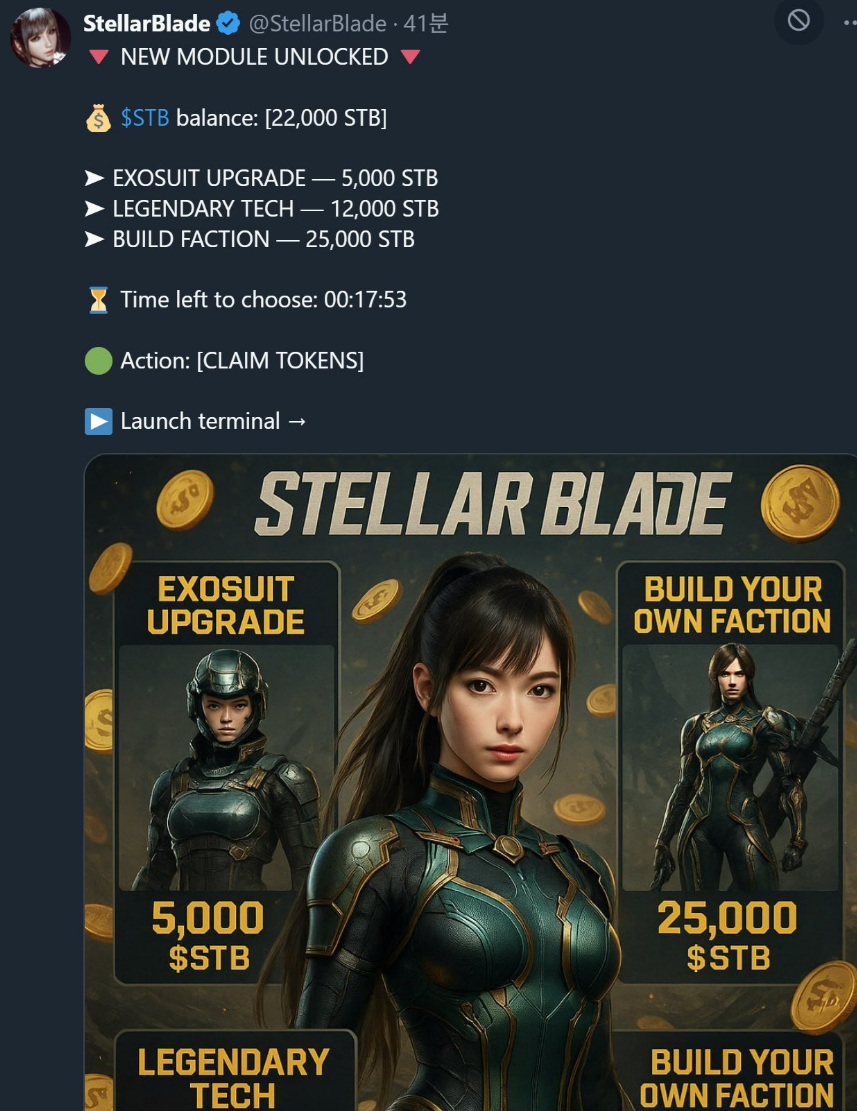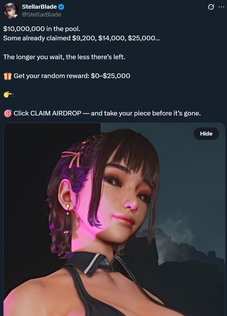 «Официальный аккаунт Stellar Blade был взломан, и сейчас на него загружаются несанкционированные сообщения, содержащие криптовалютные airdrop-ы и подозрительные акции по регистрации.