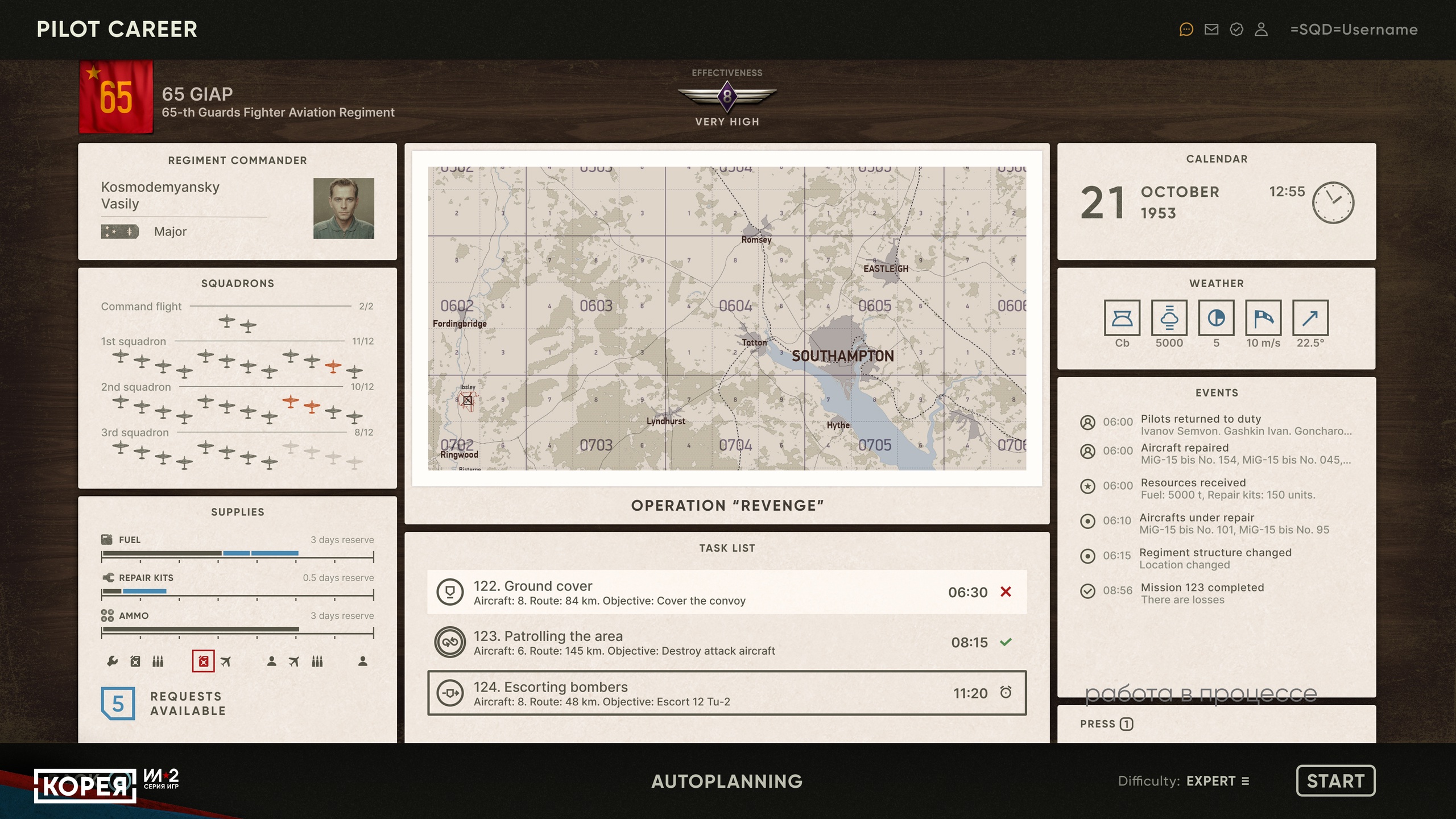«...просто повторять уже сделанное и воспроизводить этот режим 1-в-1 как он был реализована в "Великих Сражениях", конечно, не входило в наши планы. Мы задумывали "Корею" как новый шаг в эволюции наших симуляторов, и это должно было касаться всех аспектов, в том числе и игрового процесса. Поэтому мы практически полностью разложили игровой режим "Великих сражений" на составляющие и пришли к выводу, что главное направление развития "Карьеры" — это развитие так называемой "мета" части геймплея, то есть той части игрового процесса, в которой игрок участвует помимо собственно боевых вылетов. В "Великих сражениях" этот режим назывался "Карьера лётчика", где игрок выполнял поставленные задачи, и даже став командиром мог влиять на их параметры в небольшом объёме. В "Корее" же мы создаем "Карьеру командира", где игрок управляет целым полком в самых разных аспектах его существования».