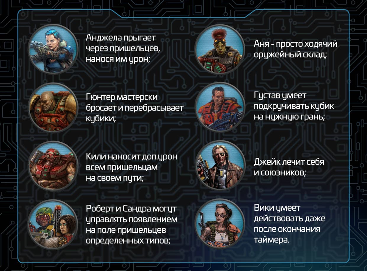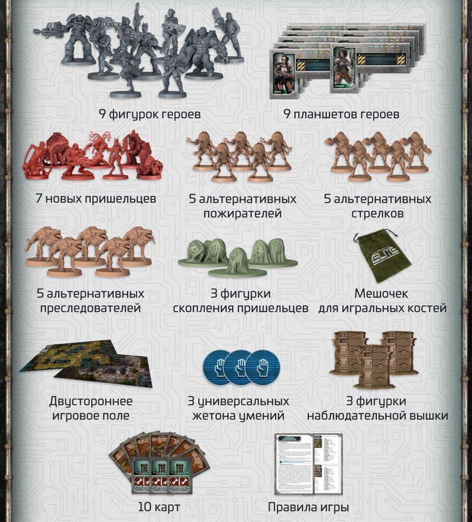Коробка содержит девять фигурок героев, девять планшетов героев, семь новых пришельцев, пять альтернативных пожирателей, пять альтернативных стрелков, пять альтернативных преследователей, три фигурки скопления пришельцев, мешочек для игральных костей, двустороннее игровое поле, три универсальных жетона умений, три фигурки наблюдательной вышки, 10 карт и правила игры.