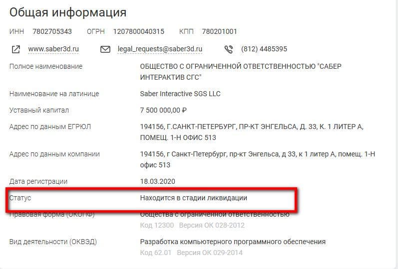 Американская компания Saber Interactive приняла решение ликвидировать юридическое лицо «Сабер интерактив СГС» с офисом в Санкт-Петербурге. Информация об этом появилась на портале «Федресурс».