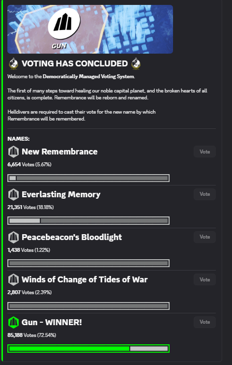 Отныне во вселенной Helldivers 2 будет существовать город с названием Gun (с англ. оружие / пушка). Этот вариант получил порядка 72% голосов, за него проголосовали более 85 тысяч раз.