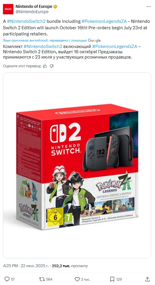 Nintendo анонсировала особую версию Switch 2, приуроченную к релизу Pokémon Legends: Z-A. Набор поступит в продажу 16 октября 2025 года и включает специальную версию консоли и саму игру.