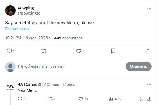 Пользователи Reddit заметили, что 4A Games наняли нового специалиста по соцсетям. Почти сразу он начал оставлять загадочные комментарии. Самый короткий и обсуждаемый — «New Metro». Позже выяснилось, что сотрудник переехал из Польши на Мальту, где расположена штаб-квартира студии. Это усилило подозрения, что анонс новой игры — уже не за горами.