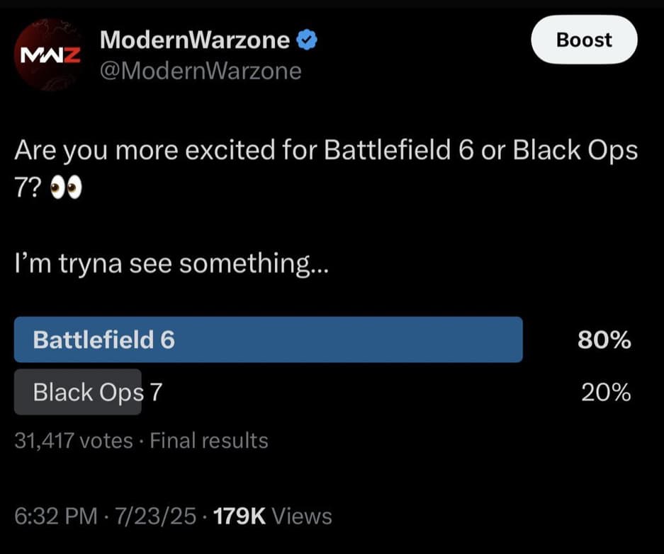 Блогер ModernWarzone, освещающий новости серии Call of Duty, провел опрос, чтобы узнать, какую игру фанаты Activision ждут больше — Black Ops 7 или Battlefield 6. Из более чем 30 тысяч респондентов 80% выбрали Battlefield 6. Результат удивил даже самого блогера, который отметил, что его подписчики — в основном фанаты Call of Duty.