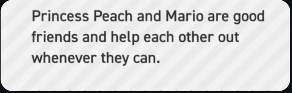 На протяжении десятилетий фанаты предполагали, что между Марио и Пич существует нечто большее, чем дружба, учитывая многочисленные сцены, где принцесса благодарила своего спасителя поцелуями или романтическими жестами. Однако Nintendo ясно дала понять, что их связь строго платоническая.