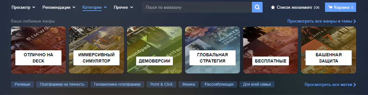 - Не только игры: вы можете искать по категориям/меткам, издателям и т.д.