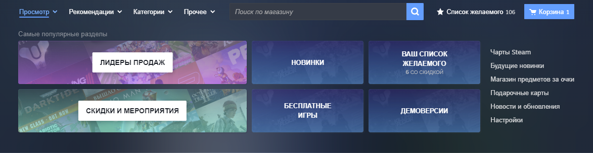 Внесли изменения в навигацию — был упрощён доступ к популярным разделам. Во вкладке «Просмотр» представлено множество опций для поиска игр по их популярности, дате выпуска, цене и скидкам.