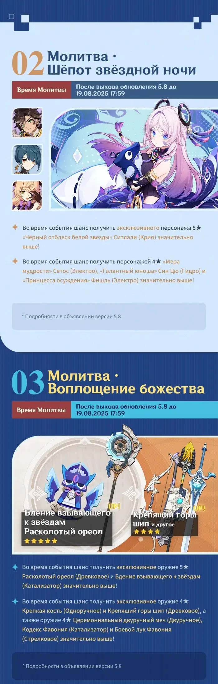 Создатели Genshin Impact 5.8 решили представить полное содержимое первых баннеров. Ранее miHoYo (HoYoverse) раскрыла лишь несколько позиций.